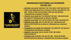 Εβδομαδιαίο Πρόγραμμα Live Εκπομπών 13/4 – 19/4 4 Days 9 Hours 9 Minutes Date 19/04/2026 Time 23:00 Location Νέα Φιλαδέλφεια, Αθήνα Venue Studio Share this… Facebook Pinterest Linkedin Viber Whatsapp Gmail Email PrintΕβδομαδιαίο Πρόγραμμα Live Εκπομπών 13/4 – 19/4