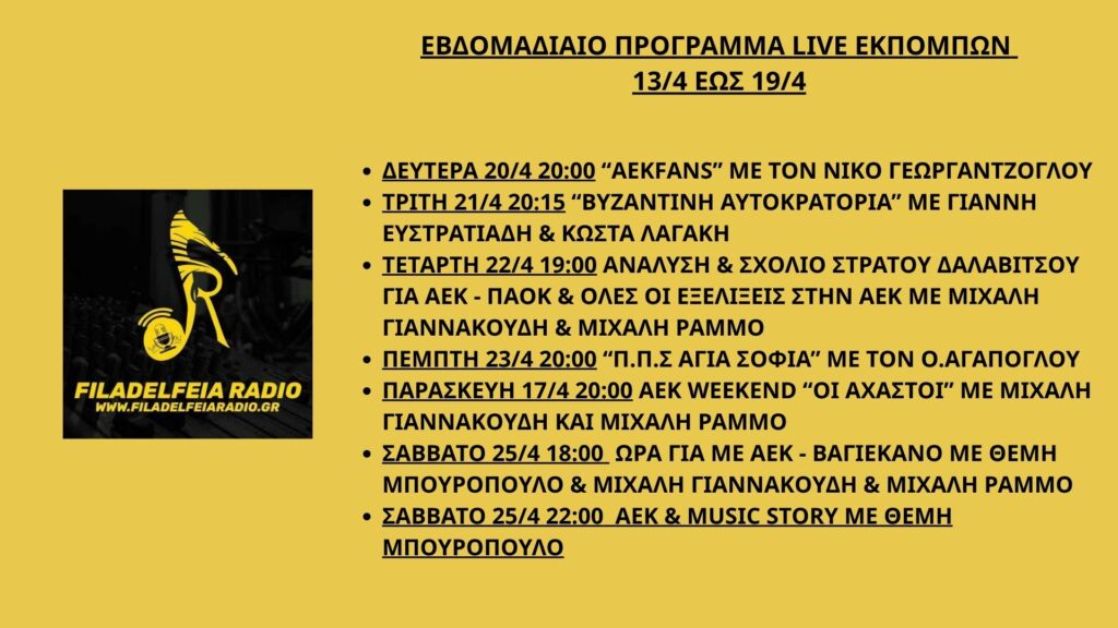 Εβδομαδιαίο Πρόγραμμα Live Εκπομπών 20/4 – 26/4 Date 26/04/2026 Time 23:00 Location Νέα Φιλαδέλφεια, Αθήνα Venue Studio Share this… Facebook Pinterest Linkedin Viber Whatsapp Gmail Email PrintΕβδομαδιαίο Πρόγραμμα Live Εκπομπών 20/4 – 26/4