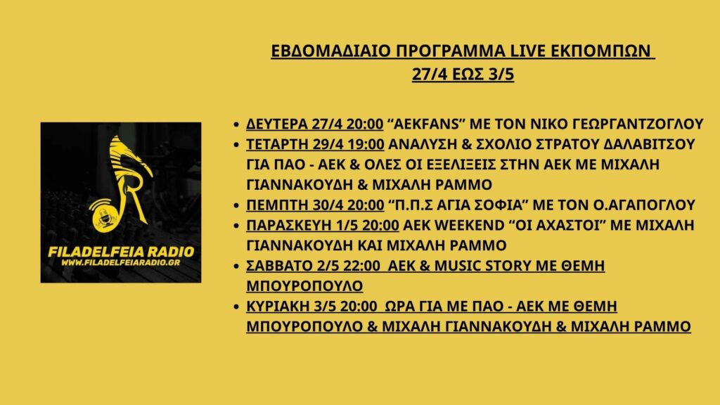 Εβδομαδιαίο Πρόγραμμα Live Εκπομπών 27/4 – 3/5 Date 26/04/2026 Time 23:00 Location Νέα Φιλαδέλφεια, Αθήνα Venue Studio Share this… Facebook Pinterest Linkedin Viber Whatsapp Gmail Email PrintΕβδομαδιαίο Πρόγραμμα Live Εκπομπών 27/4 – 3/5