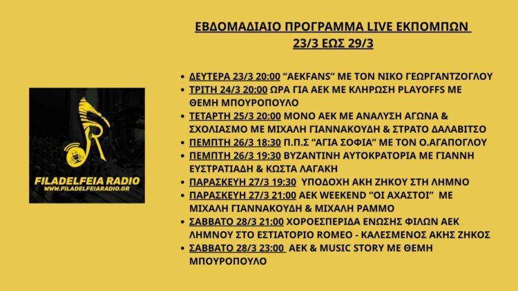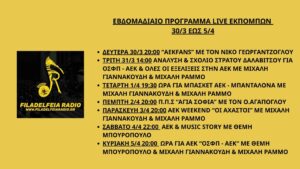 Εβδομαδιαίο Πρόγραμμα Live Εκπομπών 30/3 – 5/4 3 Days 4 Hours 22 Minutes Date 05/04/2026 Time 23:00 Location Νέα Φιλαδέλφεια, Αθήνα Venue Studio Share this… Facebook Pinterest Linkedin Viber Whatsapp Gmail Email PrintΕβδομαδιαίο Πρόγραμμα Live Εκπομπών 30/3 – 5/4