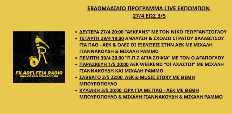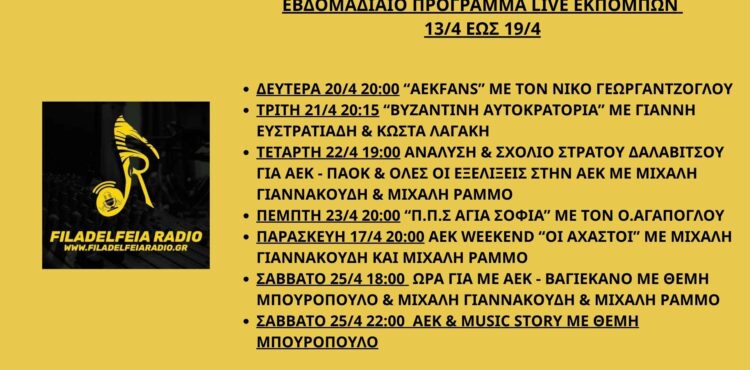 Share this… Facebook Pinterest Linkedin Viber Whatsapp Gmail Email Print Εβδομαδιαίο Πρόγραμμα Live Εκπομπών 20/4 – 26/4