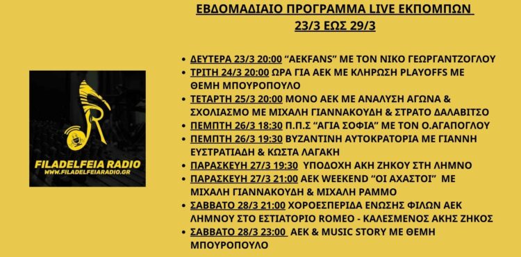 Share this… Facebook Pinterest Linkedin Viber Whatsapp Gmail Email Print Εβδομαδιαίο Πρόγραμμα Live Εκπομπών 30/3 – 5/4