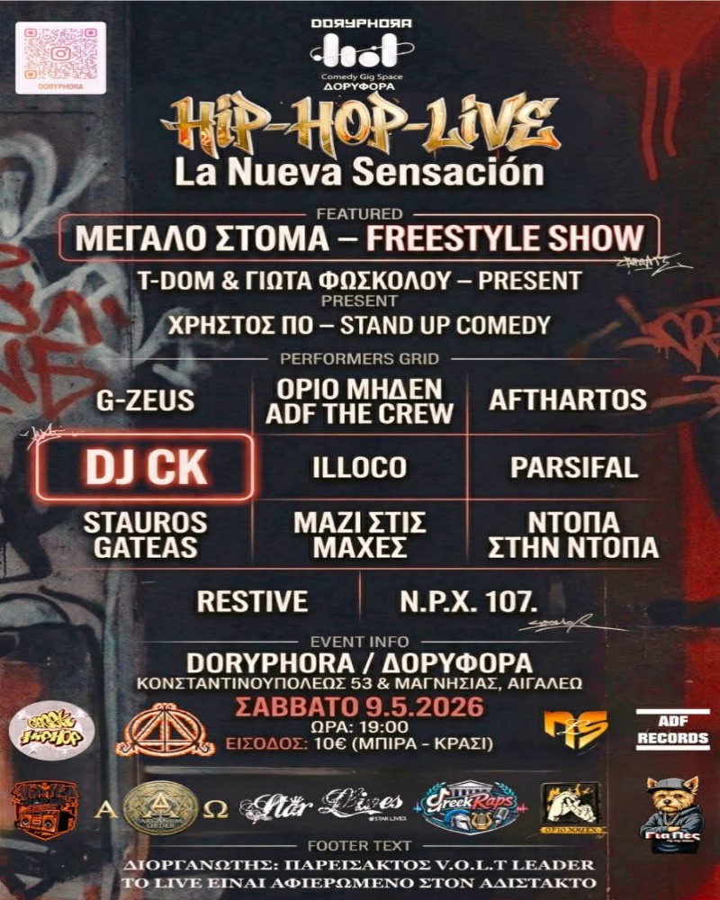 Η εμφάνισή του πλαισιώνεται από καλλιτέχνες και σχήματα που δραστηριοποιούνται στον ευρύτερο χώρο του ελληνικού underground, μεταξύ των οποίων οι Pareisaktos Leader, DJ CK, Opio Miden, ADF The Crew, Afthartos, Illoco, Parsifal, Stauros Gateas, Mazi Stis Maxes, Ntopa Stin Ntopa, Restive και N.P.X. 107.